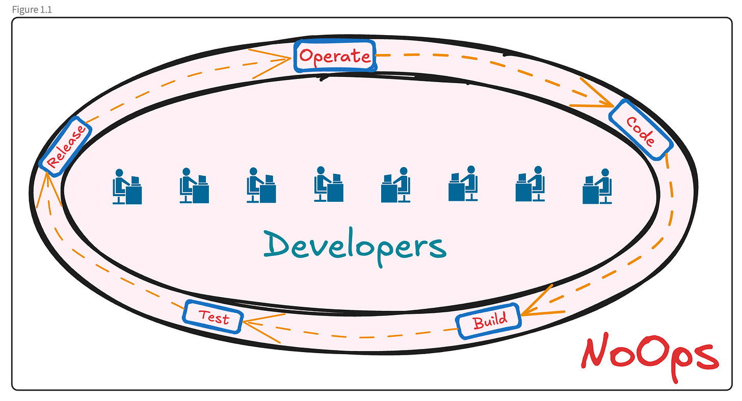 NoOps suggests that developers no longer need a dedicated operations team, as cloud platforms like AWS, Google Cloud, and Azure handle everything, from provisioning to security and scaling.